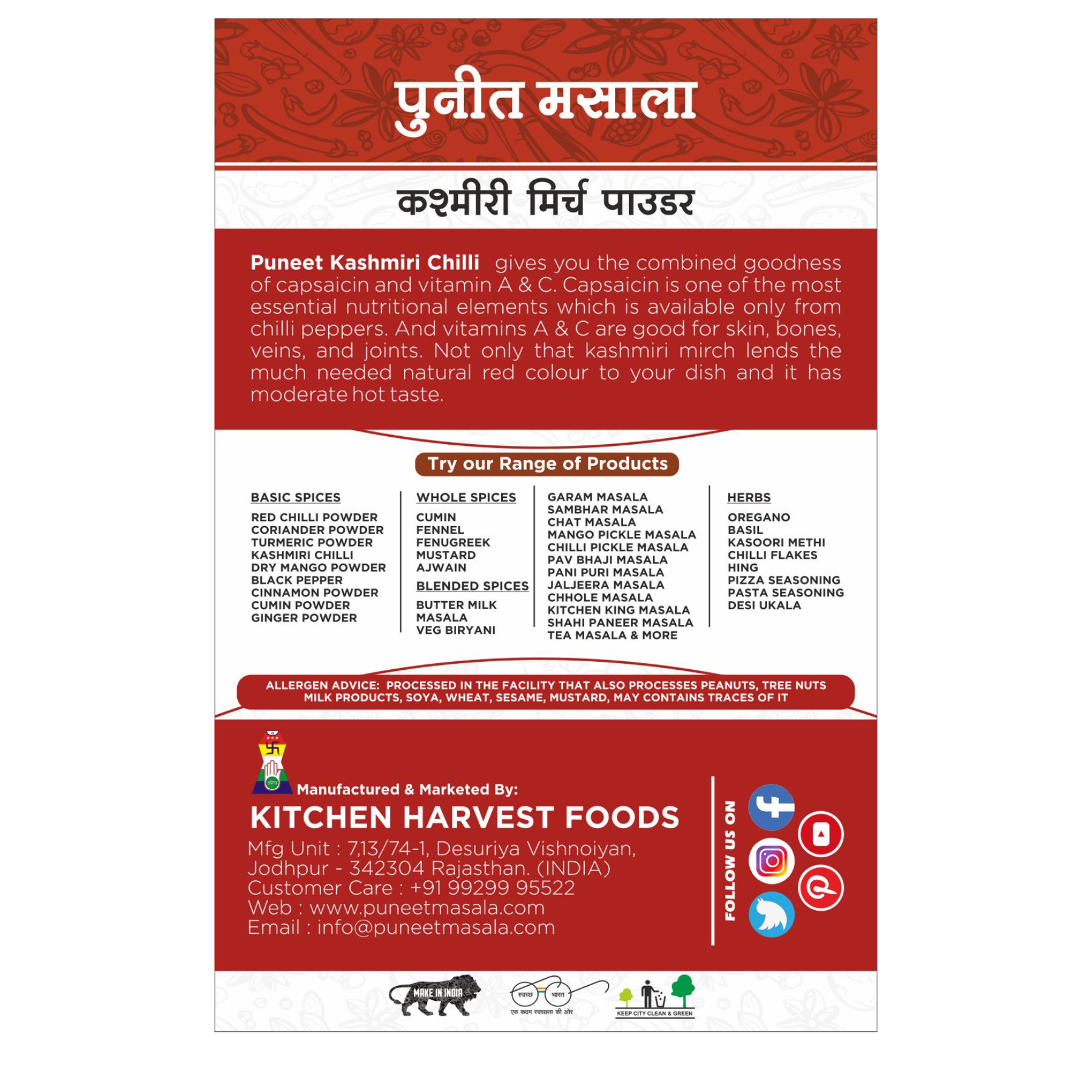 Puneet Masala's Kashmiri Chilli Powder is a culinary masterpiece designed to infuse your dishes with the vibrant and authentic flavors of Kashmiri cuisine. Carefully crafted from premium Kashmiri chillies, this spice blend offers the perfect balance of heat, color, and aromatic richness, ensuring a delightful burst of flavor in every dish.